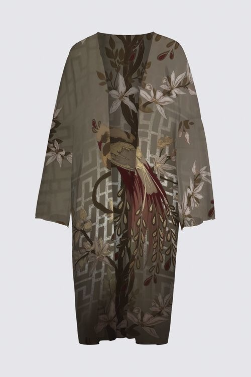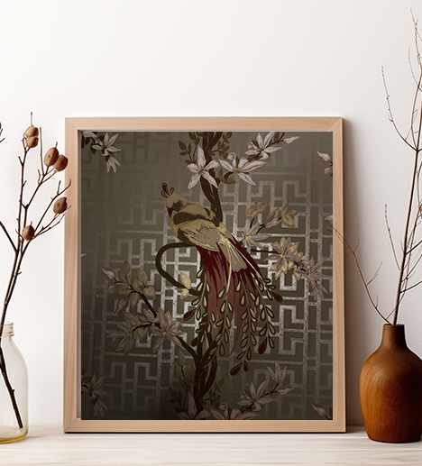 The photograph captures the exquisite detail from the interior of a boutique hotel in Amsterdam. The focal point of the image, artfully enhanced, is a beautiful bird elegantly perched on a winding branch.
