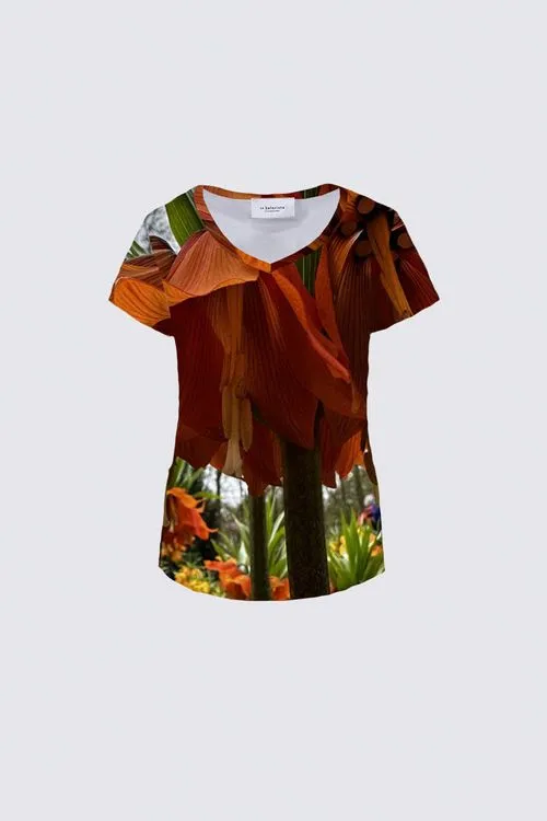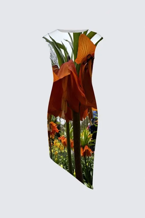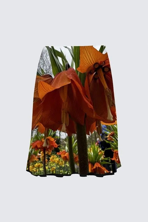 The photograph captures the allure of a large tulip in full bloom at the Keukenhof Gardens in Amsterdam. The tulip, showcased in vibrant shades of orange, stands out prominently against the lush greenery surrounding it.