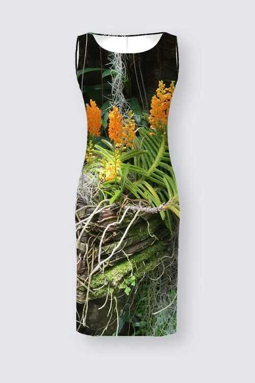 This photograph taken at Selby Gardens in Sarasota, Florida, captures a vibrant display of orange orchids in full bloom. The orchids are nestled in a rustic, moss-covered basket that is hanging amidst a backdrop of lush greenery.